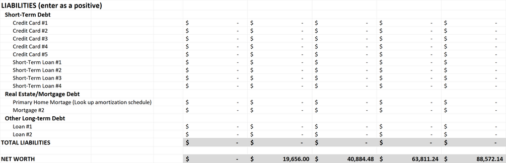 This net worth tracker starts at 12/31/2021 and goes forward in time, allowing you to put in assumptions on contributions and returns to project your balances in the future.